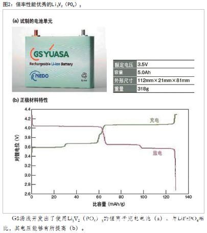 另一方面,在橄欖石類材料中,G S湯淺建議使用磷酸釩鋰(L i 3V 2(PO4)3)(圖2)。該材料不僅在安全性方面有望與L i F e P O 4相當(dāng),理論容量也高達(dá)1 9 7 m A h / g , 比LiFePO4和LiMnPO4還高出25mAh/g以上。而且,對(duì)鋰電位可以達(dá)到3.8V左右,比LiFePO4還高0.4V左右。