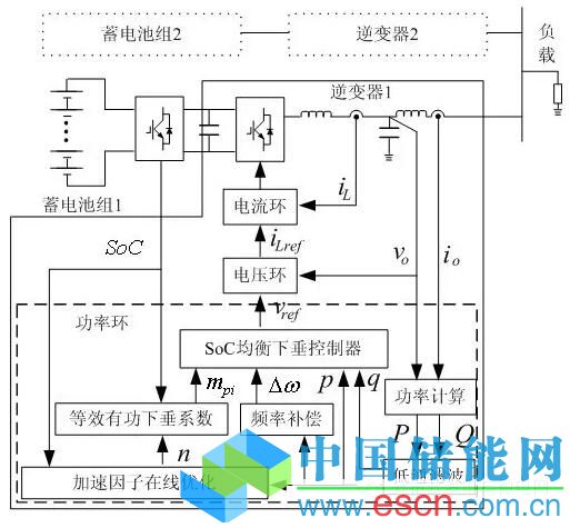 針對上述問題,提出了一種適用于多儲能設(shè)備的SOC一致性控制策略并進行優(yōu)化。將SOC作為下垂控制器輸入量,根據(jù)SOC實時調(diào)節(jié)儲能設(shè)備的輸出功率,使并聯(lián)儲能設(shè)備的SOC在放電過程中逐漸趨于一致;進而在孤島電網(wǎng)頻率偏移約束以及逆變器最大輸出有功功率限制下對加速因子進行在線優(yōu)化,顯著減小了并聯(lián)蓄電池儲能設(shè)備間SOC最終差值,達到更佳的均衡效果。仿真與實驗結(jié)果驗證了SOC一致性優(yōu)化控制策略理論分析的正確性和實現(xiàn)方案的有效性。