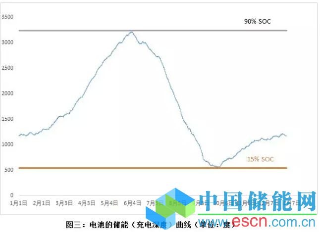 電池的年充電深度曲線見圖三,在夏季高峰前,電池的儲能達到最高峰3220度(89.5%充電深度),在夏季結束后,電池儲能降為550度(15.3%充電深度),等待秋、冬、春的三個充電季節(jié)的來臨。