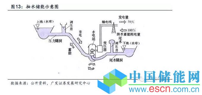 抽水蓄能是將電網(wǎng)低谷時(shí)利用過剩電力作為液態(tài)能量媒體的水從地勢(shì)低的水庫抽到地勢(shì)高的水庫,電網(wǎng)峰荷時(shí)高地勢(shì)水庫中的水回流到下水庫推動(dòng)水輪機(jī)發(fā)電機(jī)發(fā)電,效率一般為75%左右,具有日調(diào)節(jié)能力,用于調(diào)峰和備用。