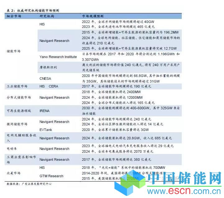 HIS、Navigant Research、Yano ResearchInstitute、摩根斯坦利、CNESA、GTM Research等研究機(jī)構(gòu)都對(duì)儲(chǔ)能市場做了相關(guān)預(yù)測,不同的機(jī)構(gòu)預(yù)測結(jié)果雖不相同,但對(duì)未來儲(chǔ)能市場的規(guī)模和發(fā)展都是樂觀的。