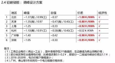 我專門算了一下利用鉛炭儲能做削峰填谷設(shè)計方案的案例,鄭丹丹主持人之前提到,全國五大地區(qū)有比較高的峰值差價,只有五大地區(qū)是有超過0.85元、0.82元、0.88元的峰谷差價,只有超過0.8元以上才會調(diào)峰,削峰填谷才有合作。杭州0.5元都是沒得做的,投資回報期都會很長。這里列出北京、天津、上海、杭州、廣州、深圳的范圍。