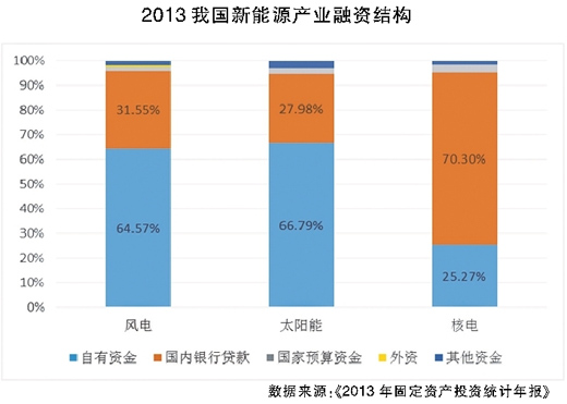 首先,融資方式較少。從融資渠道來看,新能源項目資金主要來源于企業(yè)自有資金和國內(nèi)貸款。2013年,自有資金和國內(nèi)貸款在風(fēng)電、太陽能、核電項目融資結(jié)構(gòu)中的比例分別達(dá)到96.11%、94.77%和95.57%。由于新能源企業(yè)上市門檻較高以及我國債券市場發(fā)展相對滯后,直接融資僅占資金來源的10%左右。而多數(shù)風(fēng)險投資機構(gòu)對新能源項目的投資尚處于探索階段,投資規(guī)模較小。從融資工具來看,國內(nèi)金融結(jié)構(gòu)匹配新能源產(chǎn)業(yè)的融資產(chǎn)品體系較不完善,新型抵押擔(dān)保、信托、可轉(zhuǎn)債、互聯(lián)網(wǎng)融資等創(chuàng)新融資工具應(yīng)用較少。