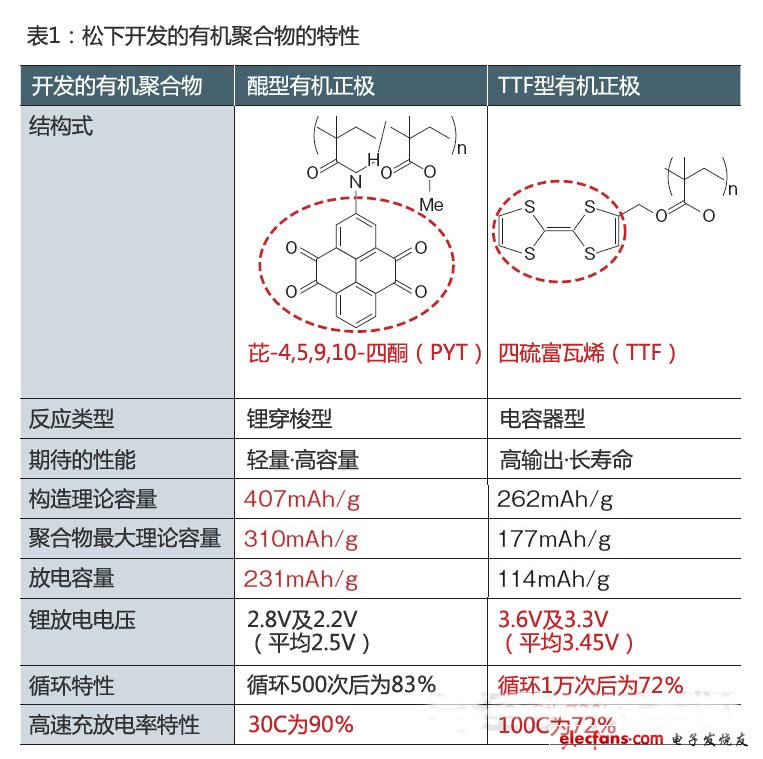 松下正在開發(fā)能量密度高的醌型和輸出密度高的TTF型有機充電電池。(圖:松下)