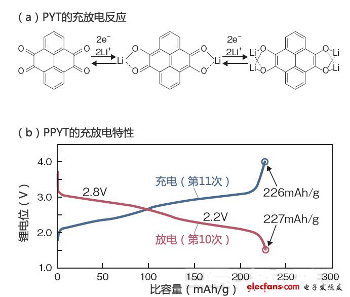醌型采用了可實現(xiàn)四電子反應(yīng)的PYT(a)。高分子化的PPYT的平均電壓為2.5V(b)。(圖:松下)