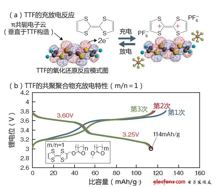 TTF型的氧化還元利用了π共軛電子云(a)。共聚TTF聚合物的平均電壓為3.45V(b)。(圖:松下)
