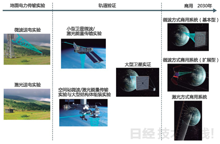 通過地面實驗確立基礎(chǔ)技術(shù)之后,反復(fù)在軌道上進行驗證,力爭2030年以后實現(xiàn)商用。(《日經(jīng)電子》根據(jù)JAXA的資料制圖,圖片全部來源于JAXA)