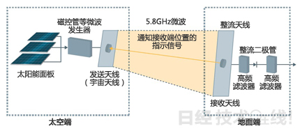 利用微波發(fā)生器將太陽能電池的直流電轉(zhuǎn)換成微波之后發(fā)送出去,通過整流電路將地面接收的微波重新轉(zhuǎn)換成直流電。發(fā)送微波時,從接收端發(fā)送指示信號來通知準(zhǔn)確的位置。