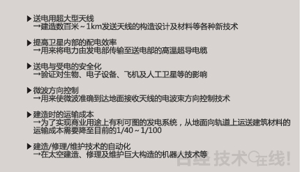 盡管宇宙光伏發(fā)電系統(tǒng)看到了實用化的曙光,但仍有很多問題需要解決(圖4)。比如,需要建造長數(shù)百米~1km的宇宙天線。在太空建造如此巨大的結(jié)構(gòu)體可以說是史無前例 注1)。需要開發(fā)結(jié)構(gòu)設(shè)計及材料等方面的新技術(shù)。此外,安全性和建造時的運輸成本也是大問題。不少人尤其擔(dān)心宇宙光伏發(fā)電使用的微波的安全性。