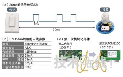 | 圖4 主攻低功耗及易用性的EnOcean 30ms間信號只傳送3次的簡單方式(a) 。 待機(jī)電流低到只有0.2μA(b) 。所使用的頻帶會依國家與地區(qū)而變。因模塊化易用性提高(c) 。 |