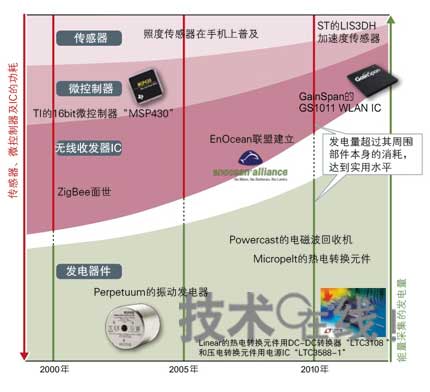 | 圖3 發(fā)電量超過本身的消耗 在發(fā)電器件性能提高的同時(shí),其周邊部件的耗電量正穩(wěn)步下降。尤其在在耗電量最大的無線收發(fā)IC領(lǐng)域,擁有很高技術(shù)實(shí)力的風(fēng)險(xiǎn)企業(yè)的面世具有重要意義。 |