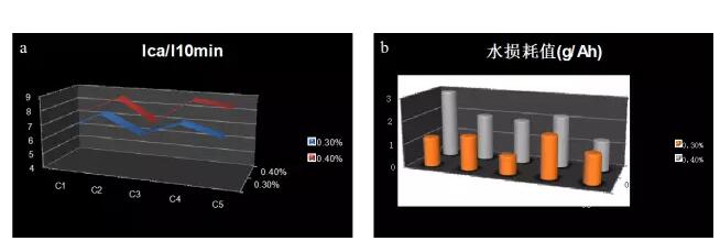 如圖7b所示,在0.3%與0.4%添加量下,C2與C4高比表面積的碳會(huì)相應(yīng)增加電池的析氫電位,使電池的水損耗值增加,因此,在選擇高比表面積的碳材料使因考慮添加量,并盡量不要使用過(guò)大的比表面積的炭黑材料(在0.4%添加量下,C1水損耗值大幅增加,可能是由于C1炭黑雜質(zhì)偏多)