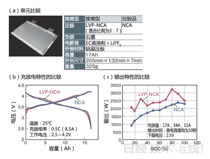 富士重工業(yè)采用將LVP與NCA按重量比3:7混合的正極試制了17Ah的層壓型單元(圖16)。能量密度為190Wh/kg(373Wh/L),平均電壓為3.64V,與僅采用NCA正極試制的單元具備基本相同的性能,同時大幅提高了輸出特性。SOC較低時的輸出特性尤為出色。富士重工業(yè)表示,通過改變混合比例,有望達到期望的輸出特性。