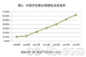 據(jù)高工鋰電產(chǎn)業(yè)研究所(G B I I)統(tǒng)計,2 0 0 9年,聚合物鋰離子電池在手機電池中的應用比例為10.7%,而到2012年,聚合物鋰離子電池的應用比例已經(jīng)達到了32.5%。預計在未來的幾年中,隨著國內(nèi)3G市場的逐步成熟,以及智能手機滲透率的快速上升,聚合物鋰離子電池將是未來手機電池中的主流,而相應的也將帶動其市場滲透率的快速上升。到2015年,聚合物鋰離子電池在手機中的應用比例將達到63.5%。(圖4)