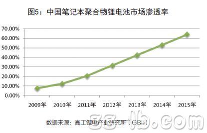 據(jù)高工鋰電產(chǎn)業(yè)研究所(GBII)統(tǒng)計,2009年全球筆記本電池采用聚合物電池的比例僅為7.6%。到2012年,聚合物鋰離子電池在筆記本電腦中的滲透率已經(jīng)達到了31.5%。預計,聚合物鋰離子電池的市場滲透率在2015年將達到64%。(圖5)聚合物鋰離子電池作為未來幾年數(shù)碼電池發(fā)展的方向,這將給鋰電池的發(fā)展帶來很大的影響。因為,在動力鋰電池、大型儲能市場還未大規(guī)模打開的情況下,手機電池仍然將作為鋰電池的最為主要的應用領域。同時,手機鋰電池應用結構的變化,將毫無疑問給其他數(shù)碼產(chǎn)品鋰電池的的應用結構帶來影響。