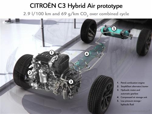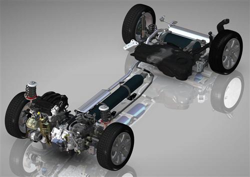 空氣混合動(dòng)力系統(tǒng)以可靠的子系統(tǒng)及技術(shù)得以實(shí)現(xiàn),包括PureTech汽油發(fā)動(dòng)機(jī)、壓縮空氣存儲(chǔ)裝置、氣動(dòng)液力馬達(dá)裝置及帶周轉(zhuǎn)輪系統(tǒng)的自動(dòng)變速箱。另有一個(gè)智能電控系統(tǒng)負(fù)責(zé)處理來(lái)自駕駛者的反應(yīng),以實(shí)現(xiàn)能效最大化。該系統(tǒng)可實(shí)現(xiàn)3種驅(qū)動(dòng)模式:空氣驅(qū)動(dòng)(零排放)模式,由壓縮空氣驅(qū)動(dòng)氣動(dòng)液力馬達(dá)提供能量;汽油驅(qū)動(dòng),僅使用來(lái)自內(nèi)燃機(jī)的動(dòng)力;混合動(dòng)力,內(nèi)燃機(jī)和氣動(dòng)液力馬達(dá)同時(shí)工作。