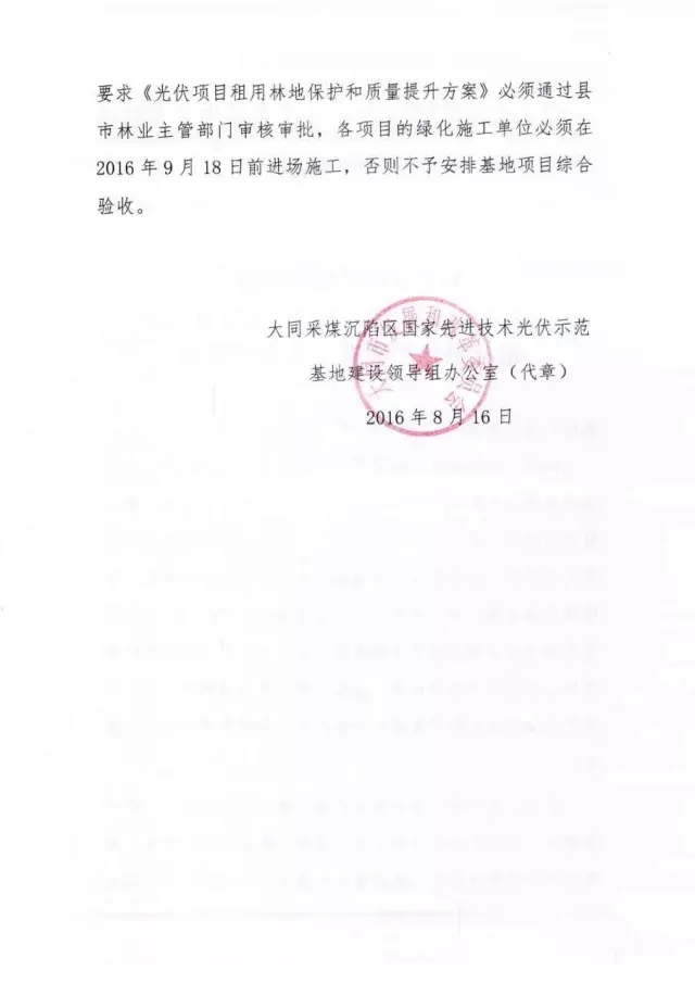 大同采煤沉陷區(qū)國(guó)家先進(jìn)技術(shù)光伏示范基地建設(shè)領(lǐng)導(dǎo)組辦公室(代章)