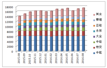 圖2 2015年8月-2016年8月國內(nèi)多晶硅分企業(yè)產(chǎn)量圖 單位:噸 來源:硅業(yè)分會