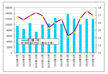 圖3 2015年7月-2016年7月多晶硅進(jìn)口量及進(jìn)口均價示意圖 數(shù)據(jù)來源:海關(guān)