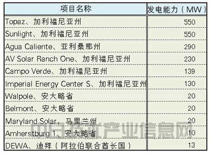 而美國First Solar在2011年以后的銷售額走勢雖然也有波動,但仍呈增加趨勢。其原因正是前面提到的,加州推進RPS制度,使針對光伏發(fā)電的投資十分活躍。以加州為中心,該公司的百萬瓦級太陽能發(fā)電項目的訂單不斷增加,2012年底至2013年初開始建設(shè)的百萬瓦級太陽能設(shè)施的數(shù)量達到了11處(表1)。