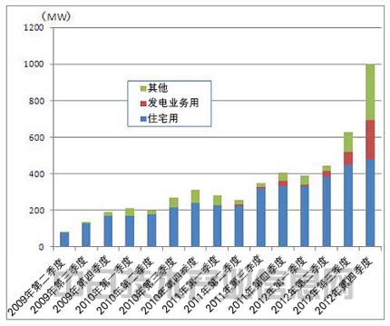取代歐洲實現(xiàn)增長的是亞洲和美洲。在亞洲,中國、日本和印度三大市場將實現(xiàn)增長。日本從2012年7月開始實行可再生能源固定價格收購制度,太陽能電池板的設(shè)置數(shù)量隨之猛增。日本的太陽能電池板出貨量在2012年第四季度首次達到了1GW(圖2)。其中,住宅用途約占一半,包括百萬瓦級光伏電站在內(nèi)的發(fā)電業(yè)務(wù)用途占2成多。