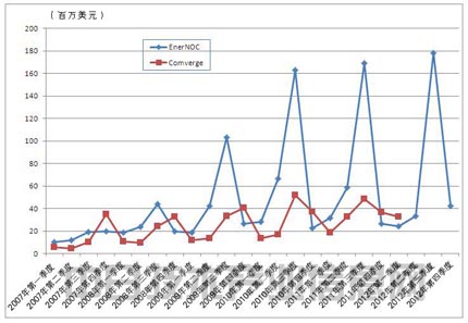 圖5:需求響應(yīng)附圖提供商的銷售額走勢。Comverge因2012年3月發(fā)布了收購消息,因此業(yè)績只公開到2012年第一季度