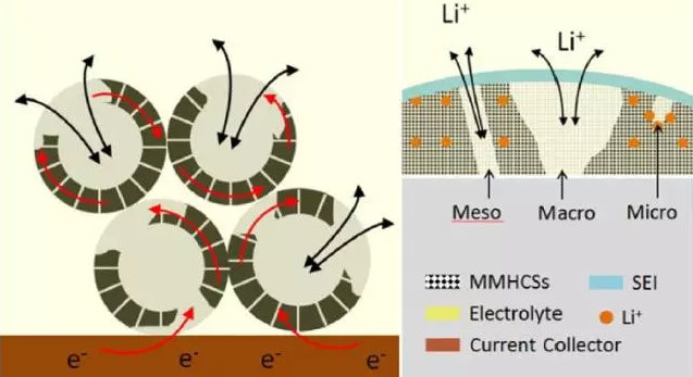 近日北京理工大學(xué)的Xinyang Yue等人基于介孔碳技術(shù)開發(fā)了一種微孔-介孔中空碳微球鋰離子電池負(fù)極材料,該材料的比表面積高達(dá)396m2/g,該材料不僅具有高容量特性,并且具有良好的循環(huán)性能,在2.5A/g的電流密度下,循環(huán)1000次仍然保持530mAh/g的比容量。該材料的倍率性能也十分讓人震驚,在60A/g的電流密度下(約為100C),該材料比容量仍然可達(dá)180mAh/g。