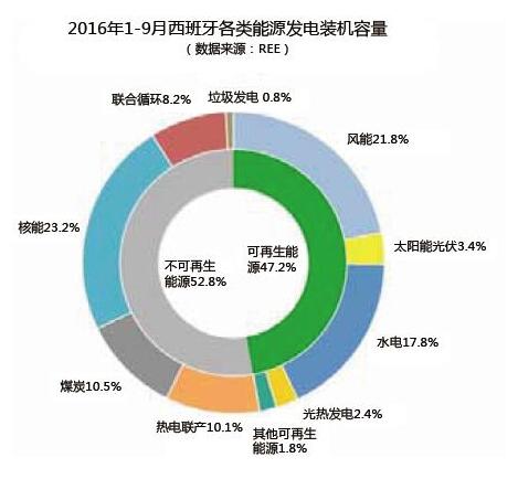 中國儲能網(wǎng)訊:據(jù)西班牙輸電系統(tǒng)運(yùn)營商西班牙電網(wǎng)公司(REE)報道,2016年的前8個月,西班牙可再生能源在發(fā)電結(jié)構(gòu)中的比重平均達(dá)到47.2%,令人印象深刻。