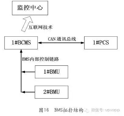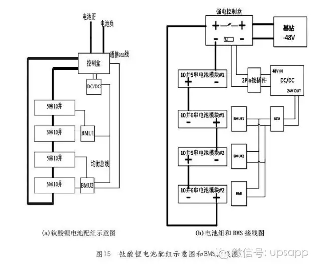 例如,某通信基站使用48V/300Ah鈦酸鋰電池(實(shí)物圖見圖14),每組電池由22只300Ah的電池模塊串聯(lián)組成,其中300Ah的電池是由10個(gè)單電芯容量為30Ah的電芯并聯(lián)組成,22節(jié)300Ah的電池模塊分別有2個(gè)6串和2個(gè)5串模組串聯(lián)組成一個(gè)48V/300AH的電池組,整組電池由BMS系統(tǒng)控制,由一個(gè)BCMS(BatteryClusterManagementSystem,主控電池管理系統(tǒng))負(fù)責(zé)管理一個(gè)電池組中的全部BMU(BatteryManagementUnit,電池組管理單元),同時(shí)具備電池組的電流采集,總電壓采集,漏電檢測(cè)功能,并在電池組狀態(tài)發(fā)生異常時(shí)驅(qū)動(dòng)斷開高壓功率接觸器,使電池組退出運(yùn)行,保障電池使用安全。兩個(gè)BMU,每個(gè)BMU負(fù)責(zé)管理12串單體電池模塊。具有電池電壓采集,多點(diǎn)溫度采集,各種保護(hù)和電池組均衡控制等功能。鈦酸鋰電池配組示意圖和BMS接線如圖15所示。
