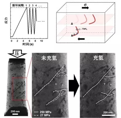 圖:循環(huán)應(yīng)力作用下,金屬鋁中的位錯(cuò)在充氫之后運(yùn)動(dòng)停止