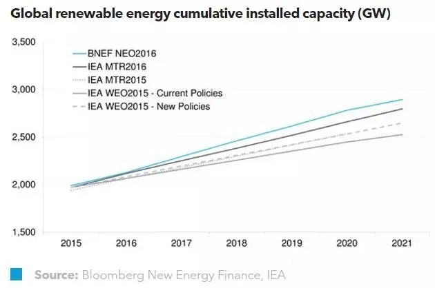 中國儲能網(wǎng)訊:10月24日,國際能源署(IEA)發(fā)布了最新的可再生能源市場中期報告(Medium-TermRenewable Energy Market Report,下簡稱MTR2016),這份報告與彭博新能源財經(jīng)的2016年新能源展望(NEO2016)有何異同?