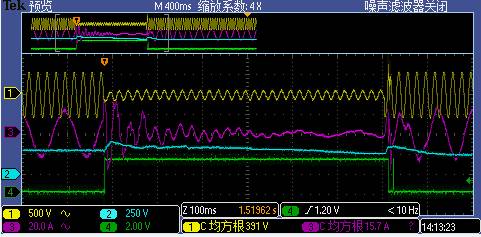問題2:不同工況下,雙饋電機(jī)并網(wǎng)發(fā)電時(shí),電流不穩(wěn),系統(tǒng)存在抖動(dòng),如下圖(1-轉(zhuǎn)子電壓,2-轉(zhuǎn)子電流,3-定子電流,4-定子電壓)