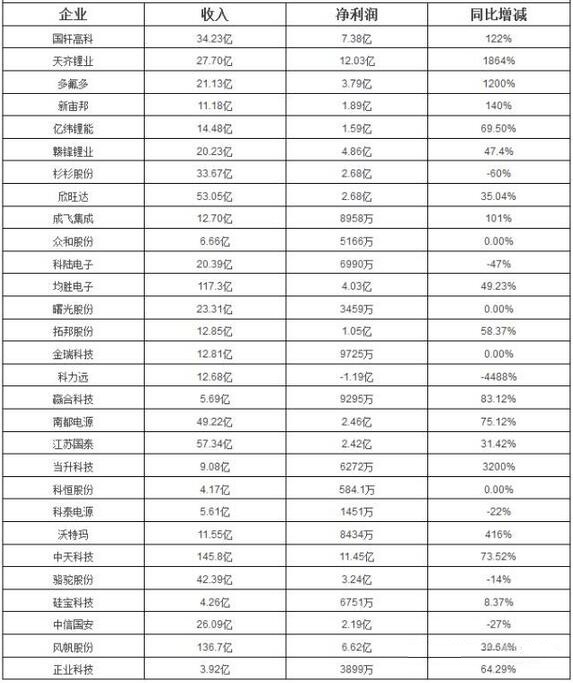 2016年29家動力電池上市公司1-9月收入一覽表