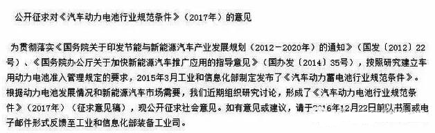 11月22日,工信部公布了最新的《汽車動力電池行業(yè)規(guī)范條件》(2017年)征求意見稿,該征求意見稿將鋰離子動力電池單體企業(yè)產(chǎn)能的門檻提高至過去的40倍。動力電池產(chǎn)能的要求提高后,電池、材料與設備行業(yè)龍頭企業(yè)將大大受益。但是,對于規(guī)模較小,產(chǎn)能無法達標的小型動力電池制造商來說無疑是場災難。