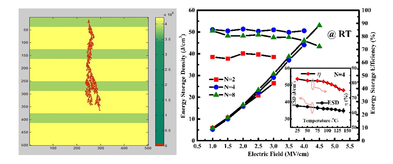 近日,西安交通大學(xué)賈春林科學(xué)家工作室劉明副教授指導(dǎo)的博士生孫梓雄利用射頻磁控濺射技術(shù)制備出高質(zhì)量的Ba0.7Ca0.3TiO3/BaZr0.2Ti0.8O3(BCT/BZT) 多層復(fù)合薄膜并研究了其儲(chǔ)能性能。研究表明在多層膜總厚度一致的情況下,通過(guò)增加周期數(shù)(BCT相與BZT相之間的界面數(shù))可以有效地提高該薄膜材料的儲(chǔ)能密度。同時(shí),通過(guò)計(jì)算機(jī)仿真模擬揭示界面數(shù)的增加可以有效地阻礙電流樹(shù)枝的發(fā)展,從而通過(guò)提高樣品擊穿場(chǎng)強(qiáng)來(lái)達(dá)到材料儲(chǔ)能密度的提高。此類(lèi)多層薄膜材料不僅表現(xiàn)出優(yōu)異的室溫儲(chǔ)能特性,同時(shí)在140oC下依然保持較高的儲(chǔ)能密度和儲(chǔ)能效率。這將有可能實(shí)現(xiàn)混合動(dòng)力汽車(chē)前級(jí)水冷系統(tǒng)的摘除,大大降低生產(chǎn)成本和提高機(jī)電系統(tǒng)的微型化。同時(shí),該項(xiàng)研究結(jié)果將對(duì)尋求更高儲(chǔ)能密度提供重要的實(shí)驗(yàn)途徑和理論依據(jù)。