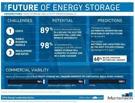 大部分能源專業(yè)認為分布式發(fā)電和可再生能源將成為未來電力行業(yè)的未來,在5-7年內(nèi)電池和電容儲能將是應(yīng)用最廣泛的儲能技術(shù),60%的專業(yè)人士認為鋰電池將是主導(dǎo)的技術(shù),但是從商業(yè)潛力上來看液流電池將具有相當?shù)陌l(fā)展空間。