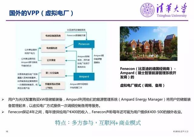 美國、德國等國家建設(shè)的虛擬電廠,體現(xiàn)了多方參與和互聯(lián)網(wǎng)+商業(yè)模式,具有一定借鑒意義。例如用戶為光伏配套購買kW級儲能裝備,Ampard(Ampard Energy Manager)利用他們的能源管理系統(tǒng)將用戶的儲能裝備管理起來,以虛擬電廠方式提供一次調(diào)頻控制備用等服務(wù)。Fenecon保證4年之間,每年提供給用戶€400的收入,F(xiàn)enecon聲稱每年還可能為用戶提供€400-500的額外收益。