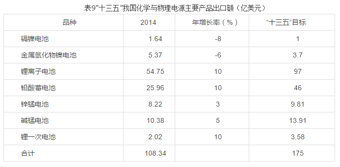 新能源產(chǎn)業(yè)作為國家“十三五”重點發(fā)展領(lǐng)域已無懸念,化學(xué)與物理電源產(chǎn)業(yè)是新能源產(chǎn)業(yè)的重要組成部分,“十三五”期間仍將保持持續(xù)、快速增長,其中傳統(tǒng)的化學(xué)電源將進入平穩(wěn)發(fā)展期,產(chǎn)業(yè)增長重點在“動力電池、儲能電池和傳統(tǒng)電池應(yīng)用”三大領(lǐng)域,增長貢獻率較大的主要電池品種有新發(fā)展IT、純電動車動力與儲能鋰離子電池和新型液流電池等;傳統(tǒng)汽車和新型汽車起停以及通信應(yīng)用鉛酸蓄電池(含鉛碳電池等)和不斷擴展應(yīng)用的鋰一次電池。2020年,我國化學(xué)與物理電源行業(yè)中的化學(xué)電源產(chǎn)品總產(chǎn)值將達到4000-5000億元左右,年平均增長率10-20%;鋰離子電池、鉛酸蓄電池將持續(xù)成為化學(xué)與物理電源行業(yè)的支柱產(chǎn)業(yè),鉛酸蓄電池保持平均8-10%增長,鋰離子電池年平均增長率20-30%;我國化學(xué)電源出口仍將保持持續(xù)快速增長的態(tài)勢,年平均增長率10-15%,出口品種增加,檔次提高,鋰離子電池將占出口總額的 55%以上。“十三五”末,我國化學(xué)電源主要產(chǎn)品的產(chǎn)量、銷售收入和出口額目標分別見表 7、8、9。