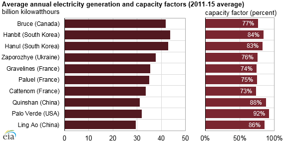 全球十大在運核電站中,美國帕洛弗迪核電站的反應(yīng)堆數(shù)量最少(近三座),但容量系數(shù)最高。根據(jù)最近五年的數(shù)據(jù)(2011-15年),帕洛弗迪核電站的容量系數(shù)平均達(dá)92%,而其他大型核電站的容量系數(shù)則介于73%至88%之間。