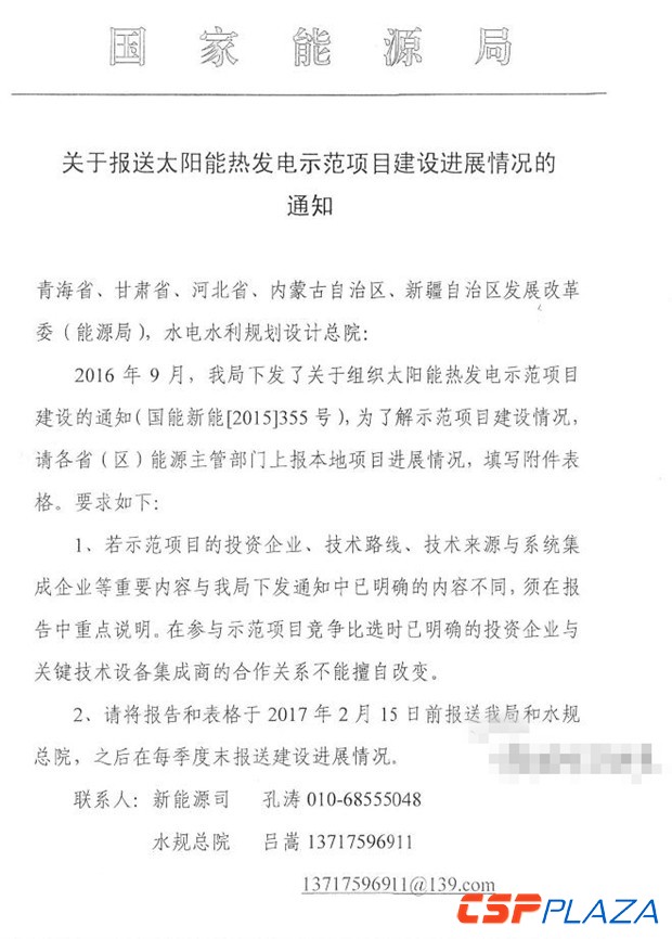 通知要求于2月15日之前將隨通知下發(fā)的太陽能熱發(fā)電示范項目建設(shè)進(jìn)度情況表(見附件)填寫完畢后報送至國家能源局新能源和可再生能源司及水規(guī)總院,此后于每個季度末報送項目建設(shè)進(jìn)展情況。