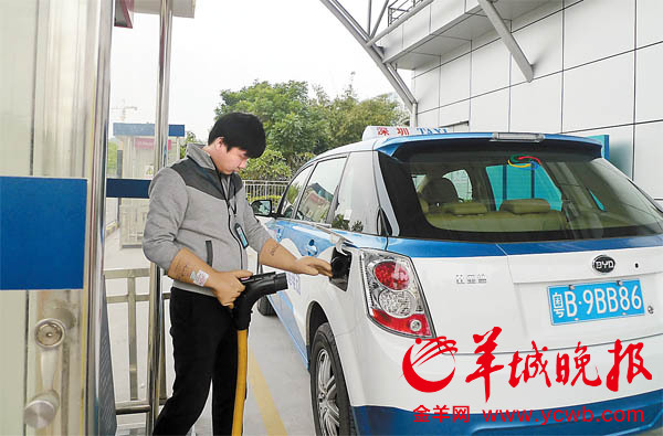 深圳福田交通樞紐電動(dòng)出租車充電站,工作人員為“藍(lán)的”充電