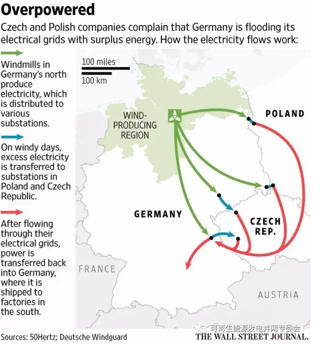 在有風(fēng)和陽光燦爛的日子里,德國產(chǎn)生的電力遠遠超過自身所需。這些多余的電力溢出德國邊境進入波蘭和捷克境內(nèi),威脅其電網(wǎng)崩潰。