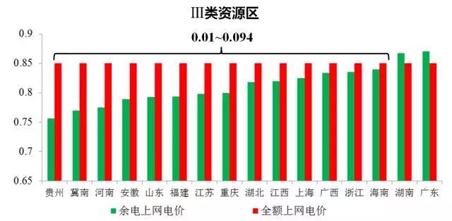 毫無疑問,自發(fā)自用電價>全額上網(wǎng)電價;對Ⅰ 、Ⅱ、Ⅲ類電價區(qū)的“余電上網(wǎng)電價“和”全額上網(wǎng)電價“進行比較,如下圖所示。