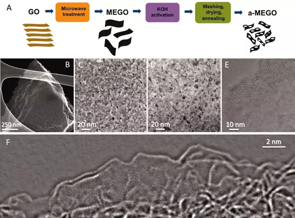 超級電容器在廣泛使用的過程中由于其低能量密度和相對較高的有效的串聯(lián)電阻而受到限制,使用電化學活化方法來剝離石墨烯,研究者們合成了一種比表面積高達3100m2/g的多孔碳,這種材料具有高的導電率和低的氧氫含量,靠sp2鍵結合的碳具有連續(xù)且高度彎曲的三維網狀結構,原子層墻最初的形成厚度為0.6-5納米寬度的孔隙,使用這種碳材料組裝的兩電極超級電容器有著高的質量電容和高能量密度,而且文章中的方法甚至可以發(fā)展到產業(yè)化中。