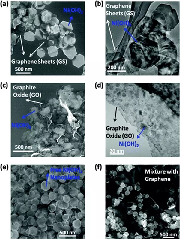 Ni(OH)2納米晶體上生長不同氧化程度的石墨烯片層作為電化學贗電容材料是一種十分有潛力的儲能應用材料。單晶Ni(OH)2六邊形納米片直接生長在輕度氧化、表面導電的石墨烯片層上,復合材料顯示出高的比電容約為1335F/g和優(yōu)異的循環(huán)性能。高的比電容和快速的充放電能力很有前途應用于能量密度和功率密度超高的超級電容器。預制備Ni(OH)2六邊形納米片和石墨烯進行一個簡單的物理混合顯示出較低的比電容,凸顯出直接在石墨烯納米材料的重要性,賦予了活性納米材料和導電石墨烯網絡之間緊密的相互作用和有效電荷傳輸。單晶Ni(OH)2六邊形納米片直接生長在石墨烯片層上的性能要優(yōu)于在小的Ni(OH)2納米顆粒上生長高度氧化的、電絕緣的網狀石墨烯。