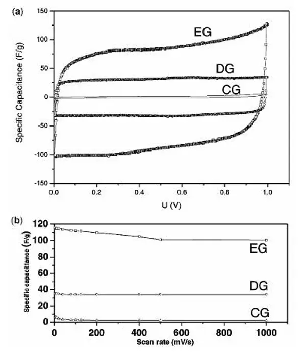 2008年,Vivekchand等人首次將石墨烯作為超級電容器電極材料。文章介紹了由三種不同的方法制備石墨烯作為電化學超級電容器的電極材料。制備的石墨烯比表面為925 m2/g,在1.0 mol/L H2SO4中,其比容量為117 F/g,當以電壓窗口較寬離子液體N-甲基丁基吡咯烷二(三氟甲基磺酰)亞胺鹽(PYR14TFS)為電解質時,其比容量和能量密度分別為71 F/g和31.9 Wh/kg。