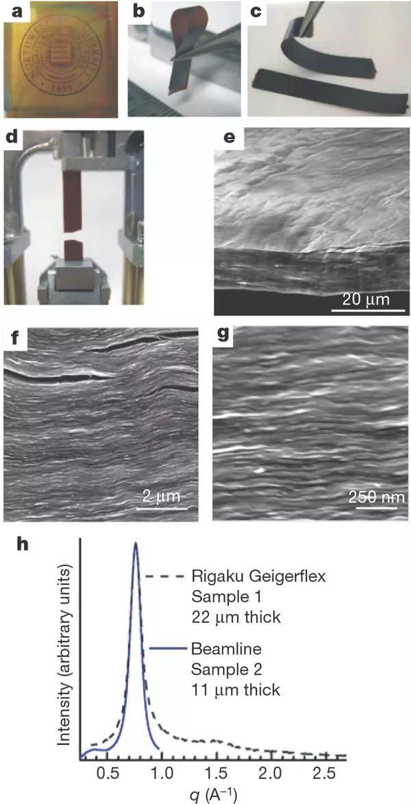 自支撐的紙型和薄膜型材料已經是當今社會技術中的一部分,它們可以應用在保護圈、化學濾器、電池和超級電容器的組分、粘結層以及分子存儲等方面,納米級的無機紙型材料(比如剝離的蛭石和云母板)已經受到很多關注,而且已經作為保護涂料、高溫粘結劑、介質阻擋和氣體防滲膜等材料商業(yè)化。來源于巴奇紙的碳納米管顯示出優(yōu)異的機械和電子性能,使它可能應用于燃料電池和結構復合物。文章報道了一種氧化石墨烯紙的制備和表征,這種氧化石墨烯紙是單個氧化石墨烯片層定流控制制備的碳基膜材料。這種新型材料在剛度和強度上超過其他很多紙型材料,這種材料結合了宏觀上剛性和柔性兩種優(yōu)點,紙型的片層之間有很大的表面相互作用力,其褶皺也處于原子級別,褶皺形態(tài)處于亞微米級別,這些條件使材料的宏觀樣品具有高效的載荷分布,也使材料相比于傳統(tǒng)的碳基、黏土基紙更有彈性。類似于氧化石墨烯的廉價原始材料促進了大面積紙型片層的制備,同時可以應用于可控滲透過濾膜、各向異性離子導體、超級電容器、分子儲存材料等。石墨烯氧化紙也可以摻雜或作為物質載體制備含有聚合物、陶瓷和金屬的混合材料。另外,分層的氧化石墨烯片層表面有許多化學官能團使材料具有更多功能。