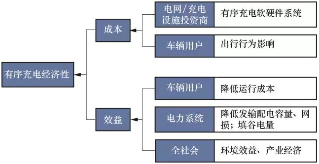 電動汽車參與需求響應(yīng)的經(jīng)濟性包括成本和效益兩方面,其中充電調(diào)節(jié)的成本包括實現(xiàn)有序充電技術(shù)的軟硬件成本以及電動汽車用戶改變充電行為的支付意愿;充電調(diào)節(jié)的效益主要包括電動汽車有序充電的高峰負荷削減、填谷電量以及由此產(chǎn)生的環(huán)境效益(見圖8)。