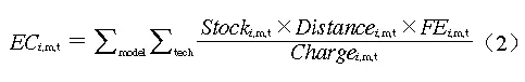 式中:ECi,m,t為第i年m型車輛t動力技術(shù)充電量需求,kWh;Stocki,m,t為第i年m型車輛t動力技術(shù)車輛數(shù),輛;Distancei,m,t為第i年m型車輛t動力技術(shù)運行里程,km;FEi,m,t為第i年m型車輛t動力技術(shù)能效,kWh/km;Chargei,m,t為第i年m型車輛t動力技術(shù),%。