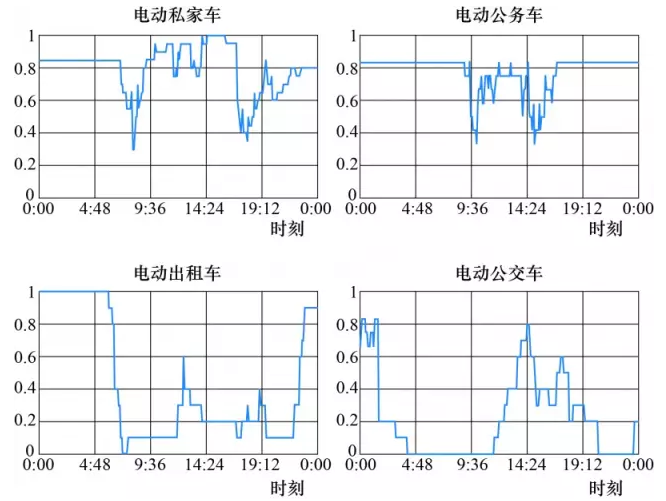 在上海市電動汽車用戶行為調(diào)研中發(fā)現(xiàn),在公交、出租等車輛運營部門,由于出行強度高,充電量需求大,適應(yīng)負荷調(diào)控的停車時間有限,導(dǎo)致模型對充電行為的優(yōu)化空間較小。相比之下,電動私家車、電動公務(wù)車停車時間較長但實際充電時間較短,尤其在負荷峰谷時段(中午12點及凌晨5—6點),相當(dāng)比例的電動汽車處于非充電的停車狀態(tài),具有較高需求響應(yīng)調(diào)節(jié)潛力(見圖5)。對于一般私家電動汽車,平均每日出行時間一般在2~4h之間,剩余20h停車時段都可接入電網(wǎng)參與需求響應(yīng)調(diào)節(jié),因此其參與需求響應(yīng)具有較大調(diào)節(jié)空間。